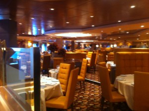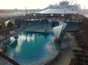 Inside the ship has numerous bars and restaurants, as well as a larger casino. The main facilities are also spread across three main decks. The theatre onboard is of double height, with no posts blocking views, and the ship has a great waterfall in the Atrium and a cool glass piano. I really enjoyed the Casino, now I’m not a gambling man (Unless its thousands of pounds and a Mersey Ferry) and the Disco on the back of the ship has a great view and a cool feel. There was lots of open deck space around the pool, with an outdoor TV and a performance area, where you can take dances under the stars.
