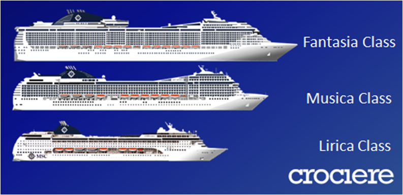 MSC Orchestra is one of the four Musica Class cruise ships, the Muscia class is MSC’s middle-sized ship, the larger being the Fantasia Class, and the smaller being the Lirica Class (Which Opera was part of). The picture below should be to scale. The pictures are from the excellent www.nauticalcities.com.