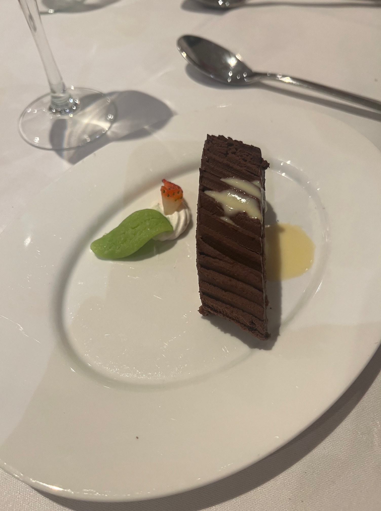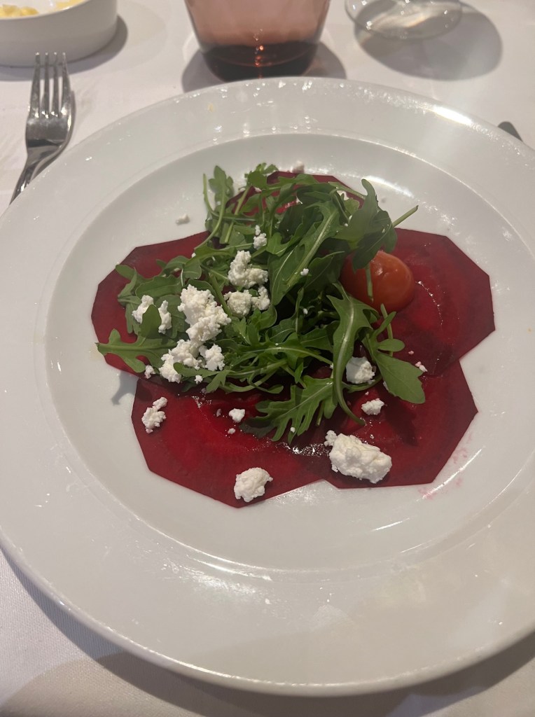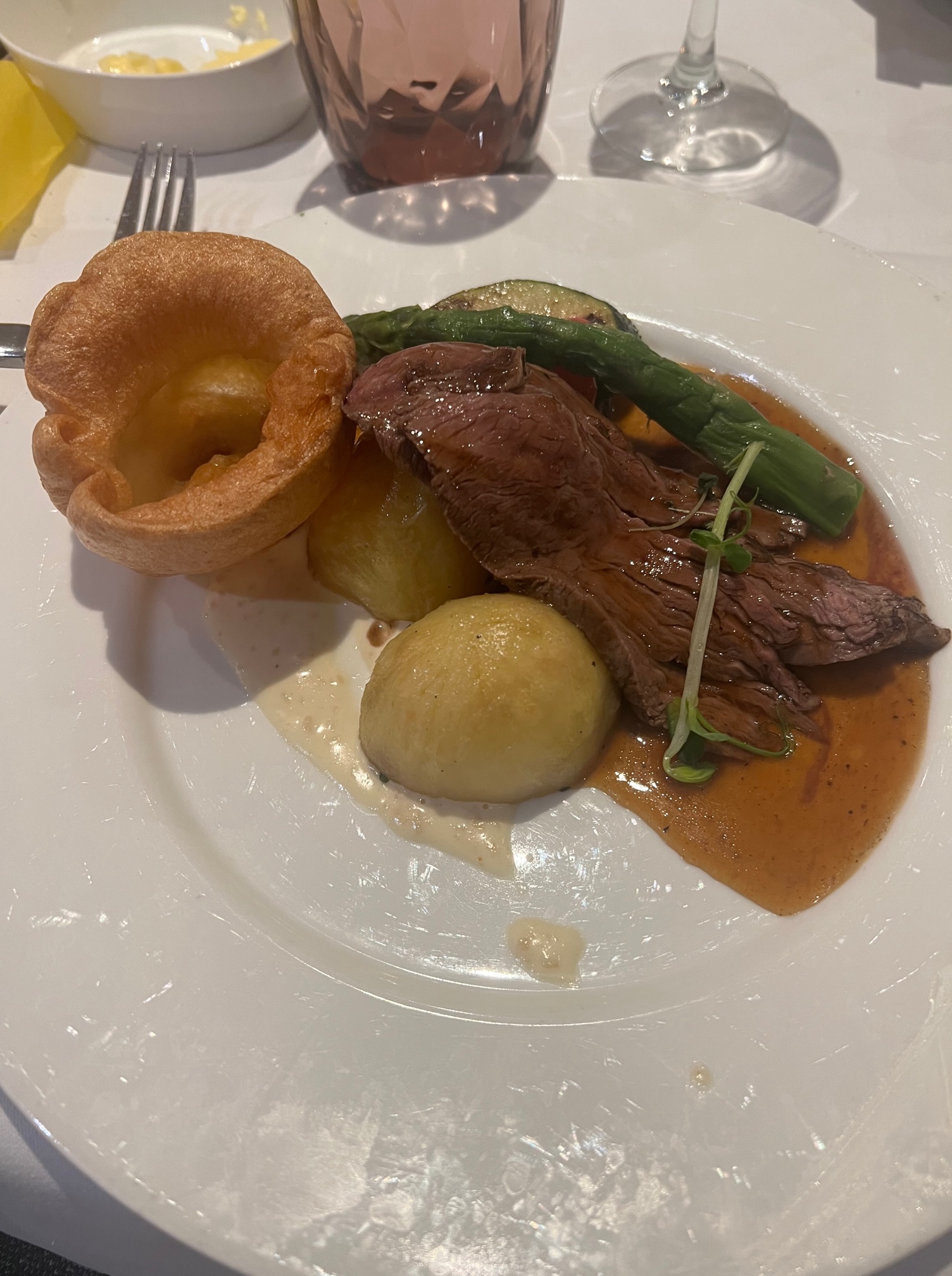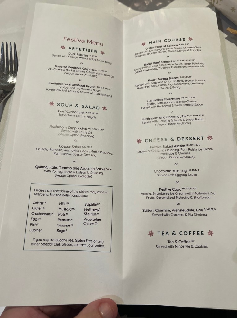 The meal was brilliant, it was a four-course meal included two glasses of wine and was delicious. For starter I had Roasted Beatroof Carpaccio, Soup/Salad course I had Quinoa, Kale, Tomato and Avocado Salad. Main I had Roast Beef and for Dessert I had the Christmas Yule log. Of course there was the baked Alaska parade to get everyone cheering at dessert. The food was really delicious and there was a good variety on the menu, the others on my table were also happy with the food and service.