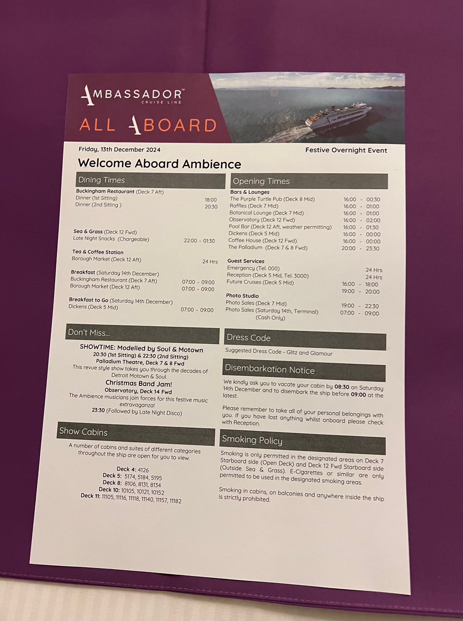 Overall I thought Ambience was a comfortable and welcoming ship, wonderfully decorated for the festive season and once again Ambassador delivered great food onboard, which for me is such an important part of the cruise. I still hope that Ambassador will continue to expand the tradition across the UK, it would be brilliant in Liverpool!