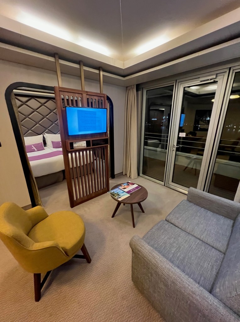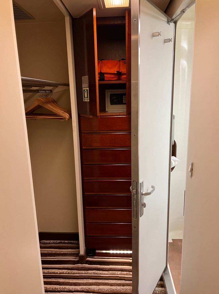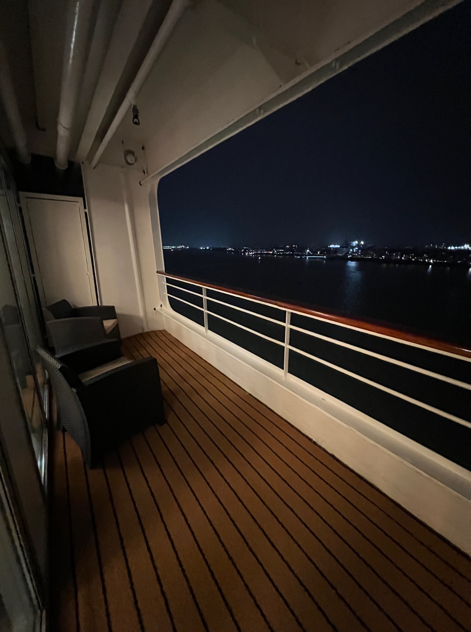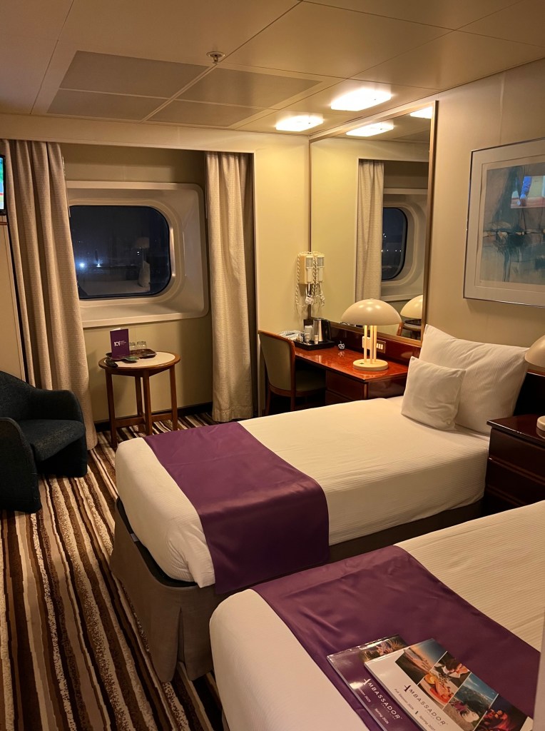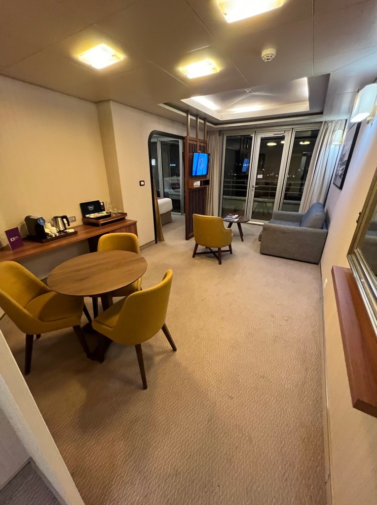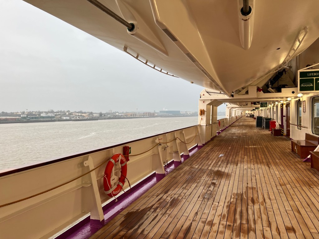 The Festive Event is really popular and quickly sells out, This time I secured a cabin on Deck 10, outside with a large picture window, at the front of the ship. This cabin was in a great location to go onto the viewing platform at the front of the ship, sadly, being Tilbury in December, there was not much to see. The cabin was smart and clean however at 33 years of service is showing some wear and tear, but not an issue. One of the benefits of the festive event is they open showrooms across the ship so I also took photos in one of the balcony suites.