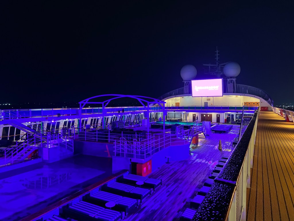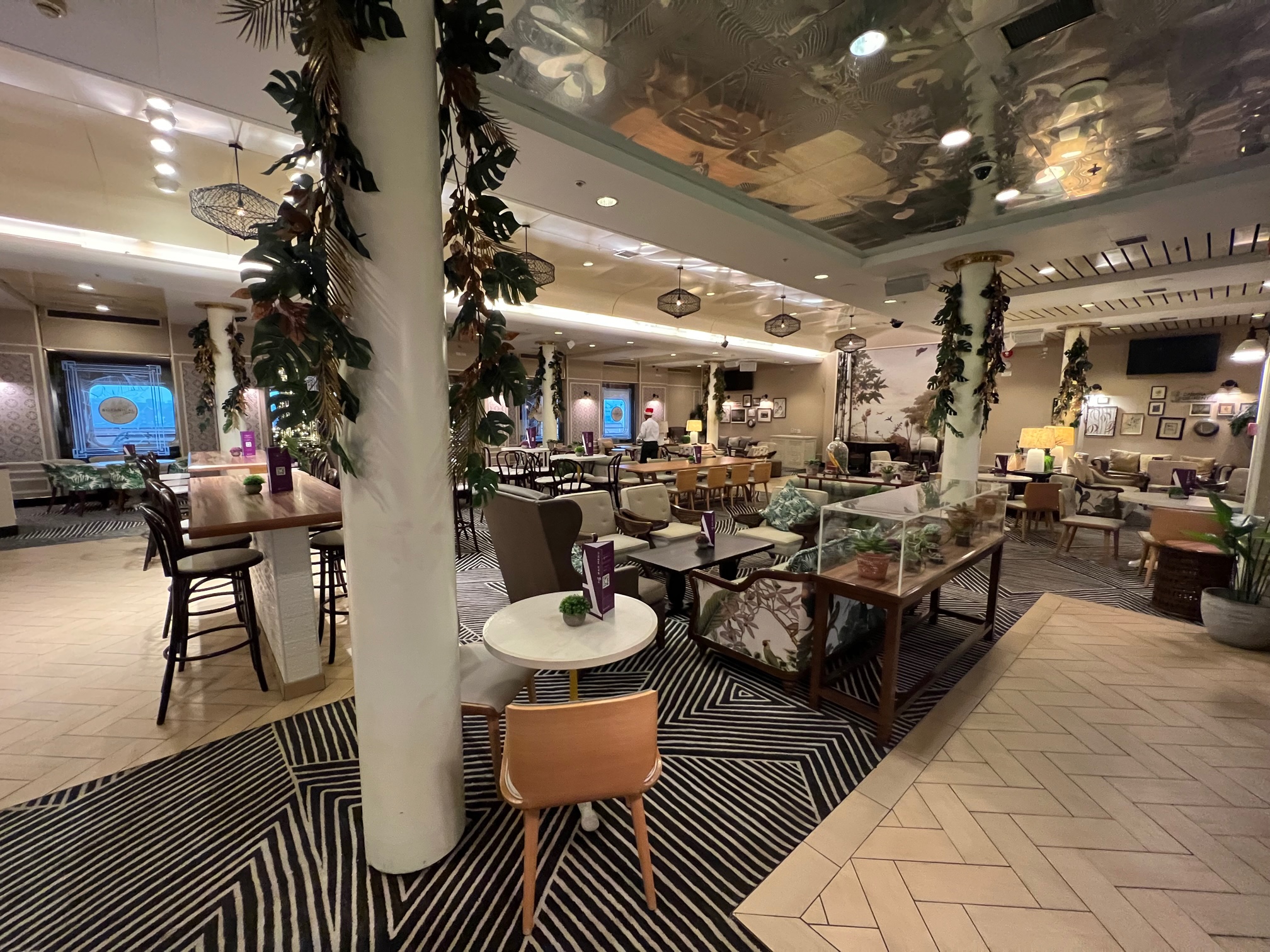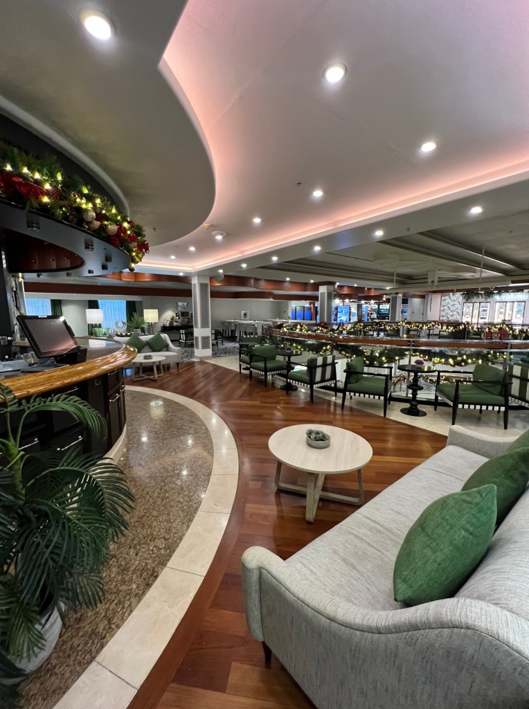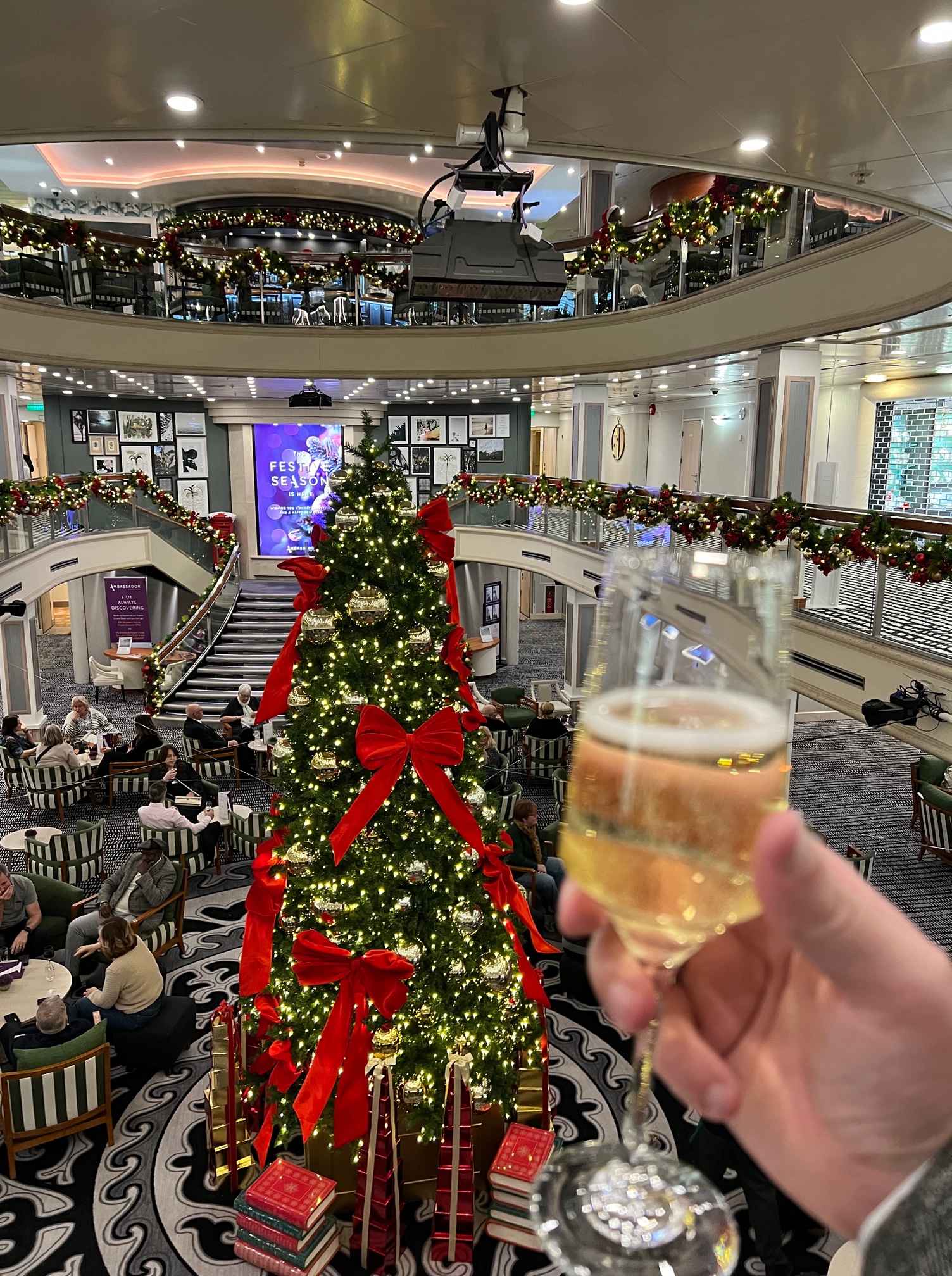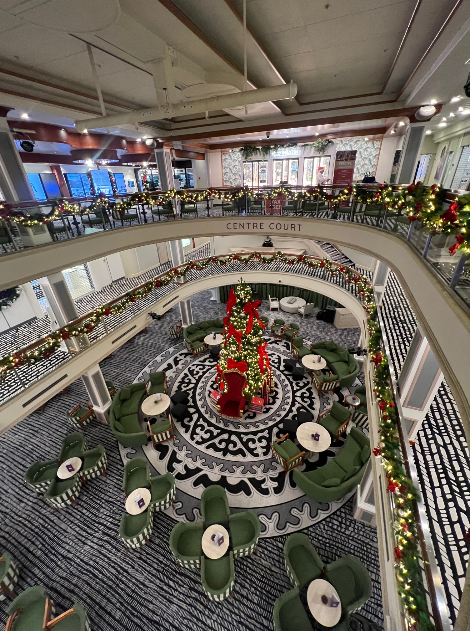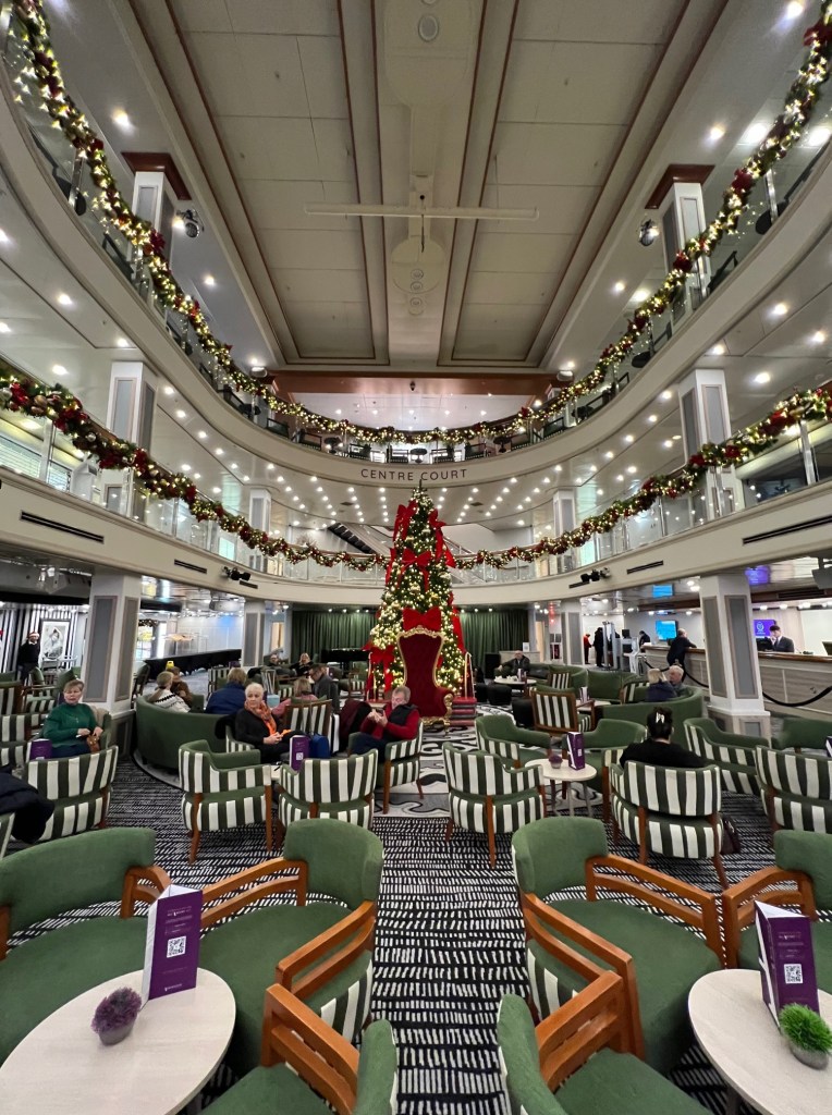 After the meal there was a show in the main theatre, I was less impressed with this as it felt of lower quality, however, the ship’s theatre is a significant space and double height. Not entertained by the entertainment, I took the opportunity to look around. My favourite place was probably the bar SW19 on the top level of Centre Court (the ships Atrium). This three-story atrium has been modernised and refreshed through the ship’s operation so looks excellent decorated for Christmas. The Observatory above the bridge on the top deck is an excellent space, and one I think most passengers would enjoy.