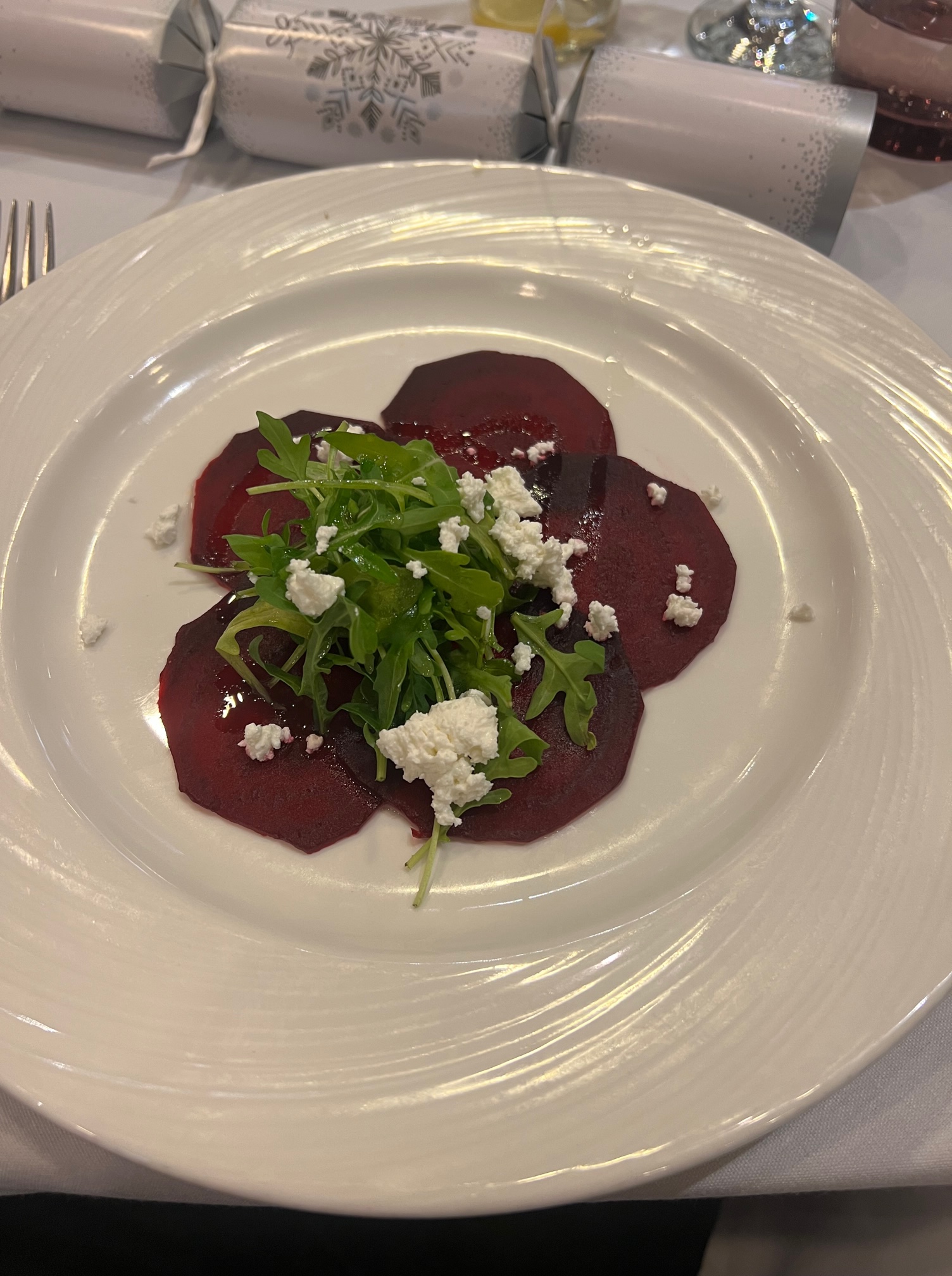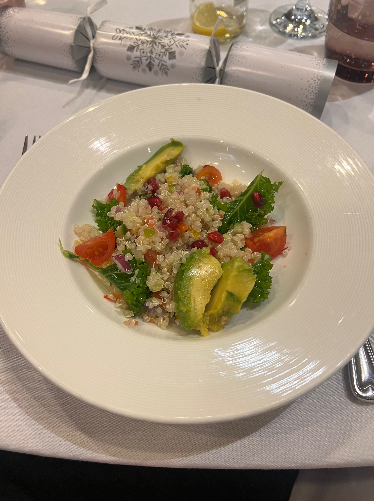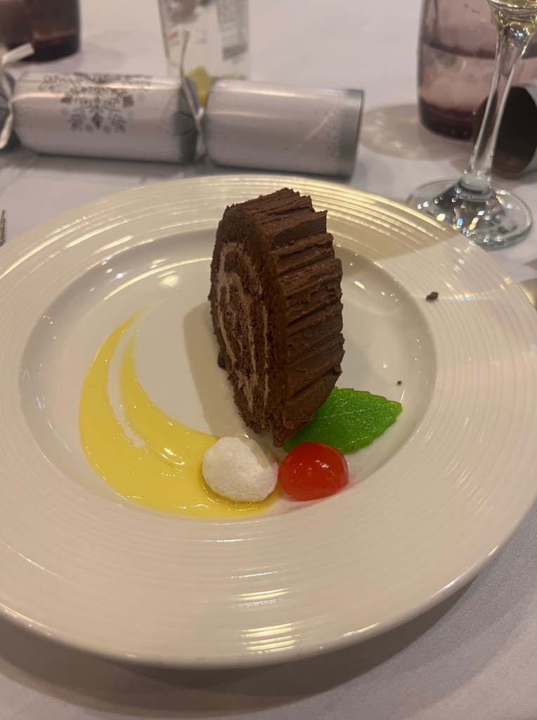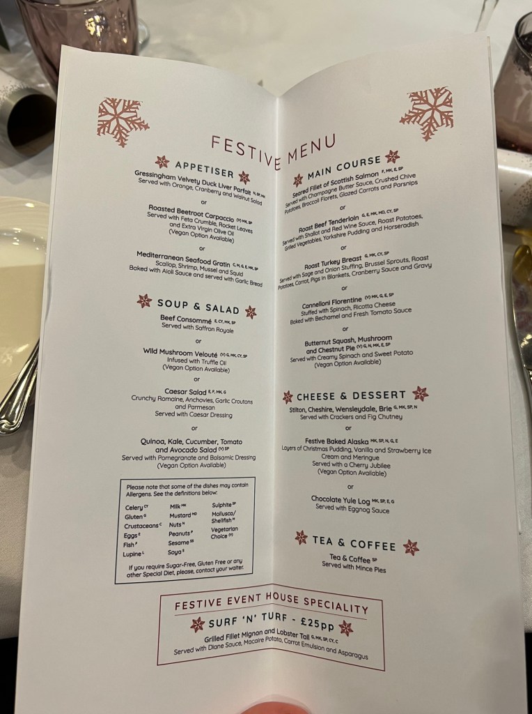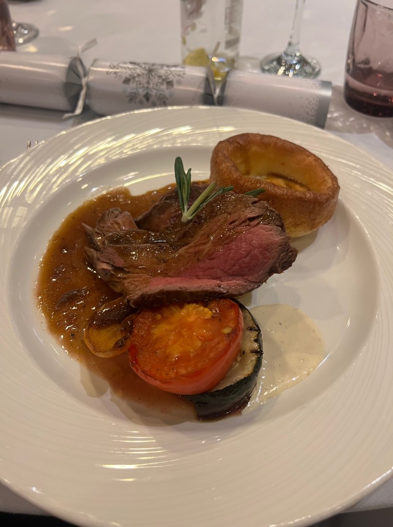 The food onboard was excellent and accompanied by wine, I – unwittingly – ordered exactly the same thing I had a year earlier, for starter the Roasted Beatroof Carpaccio, Soup/Salad course I had Quinoa, Kale, Tomato and Avocado Salad. Main I had Roast Beef and for Dessert, I had the Christmas Yule log. The staff were really helpful and friendly and the ships Buckingham Restuarant is smartly presented.
