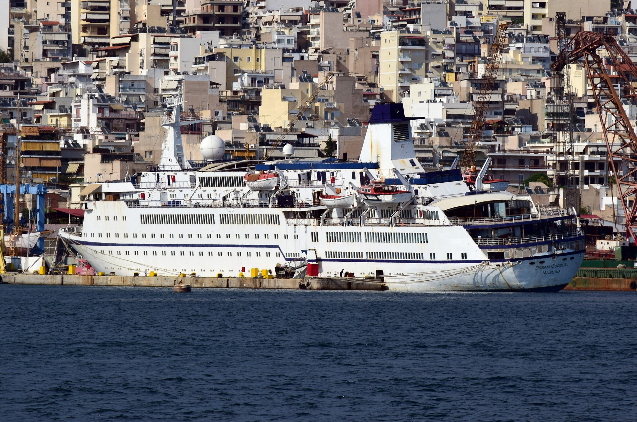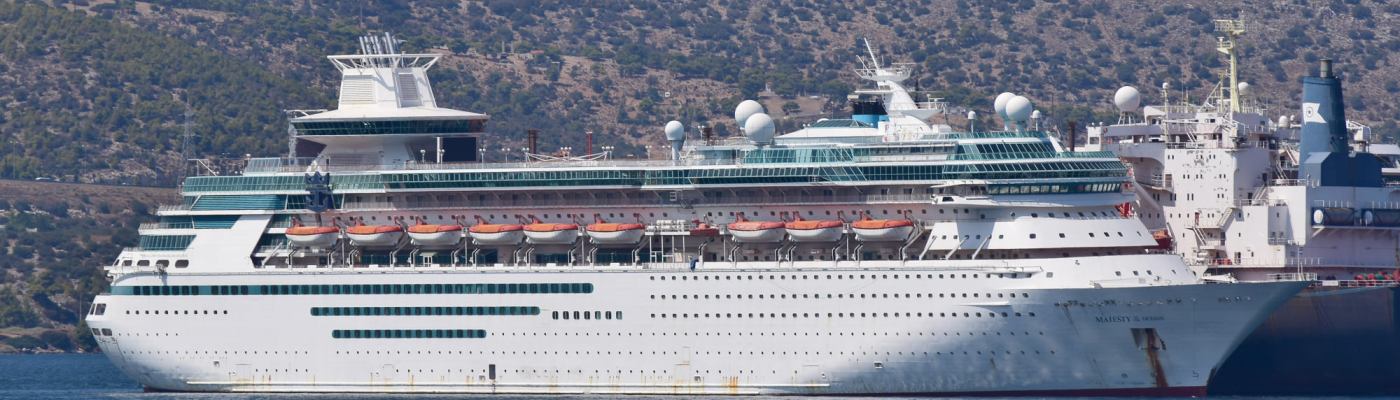 Still wearing her Royal Caribbean Logo, but now owned by Seajets the former Majesty of the Sea’s is laid up in Greece with an uncertain future. A Sovereign-class ship, once the largest cruise ships in the world. Majesty of the Oceans was delivered in 1992 and is 270 meters long with a capacity for 2767 passengers. A lack of balcony cabins is likely to lead to Majesty of the Ocean’s joining sisterships Sovereign of the Seas and Monarch of the Seas to be scrapped.