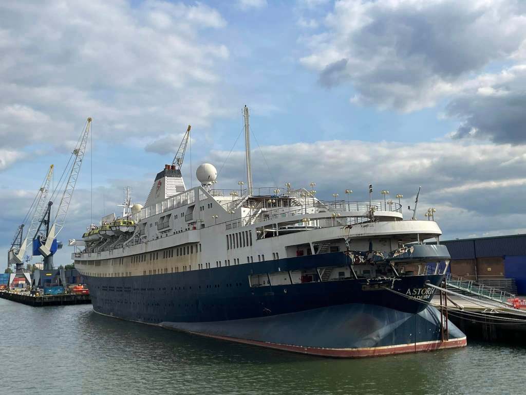 The world’s oldest cruise ship, having entered service in 1948 Astoria has been laid up in the Port of Rotterdam since the collapse of CMV during 2020, it was bought by a crypto millionaire during the pandemic but now is expected to be broken up as it is in poor condition.