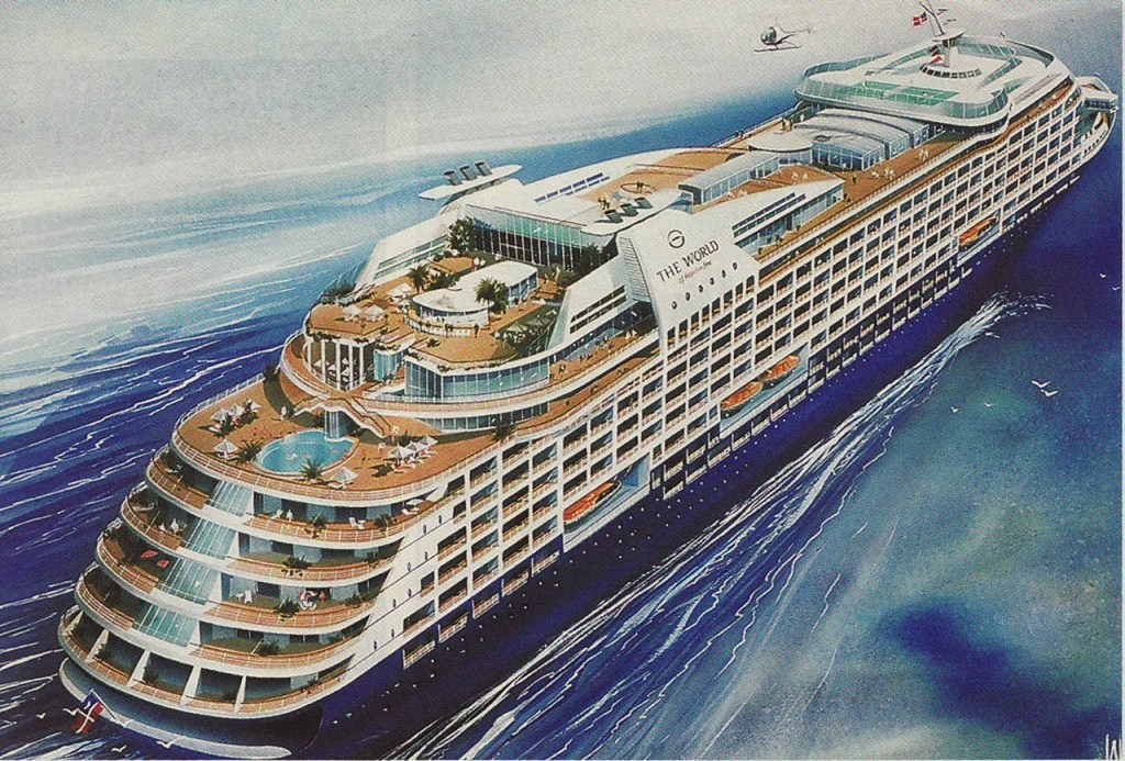 The idea behind Norwegian Cruise Line’s founder Knut Kloster – The World was first proposed in 1997, with a preliminary contract signed with a German shipyard for a 430 residence cruise ship launching in 2000. Sales, however, did not reach the 430 mark, so the ship was repeatedly scaled back and finally launched in 2002 as the 165 residence ‘The World’.