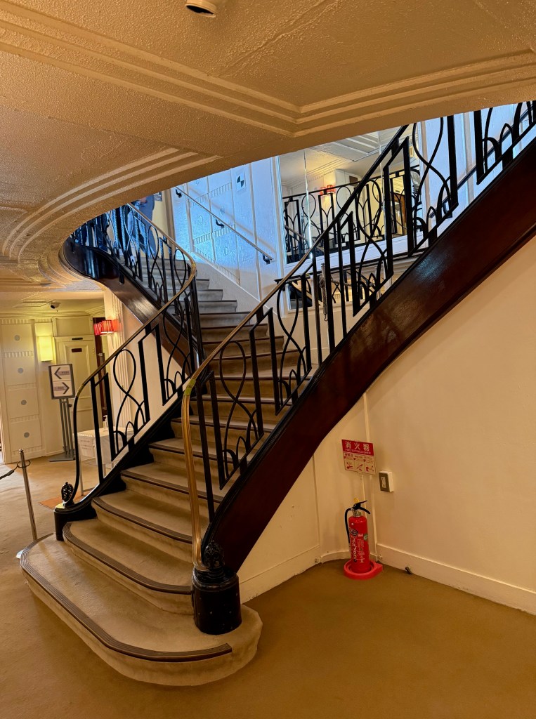 Launched on 30 September 1929, and made her maiden voyage from Kobe to Seattle on 13 May 1930, Hikawa Maru was one of three motor ships built by NYK Line for the Pacific route. We are, in the Europe at least, much more familiar with the transatlantic liners sailing between Liverpool, Southampton, Le Harve and New York. But this important service between Japan and America ran a regular route at a slower pace, with smaller ships. She was nicknamed the Queen of the Pacific and known for her attentive service and excellent food. Hikawa Maru was built and remains in an Art Deco style.